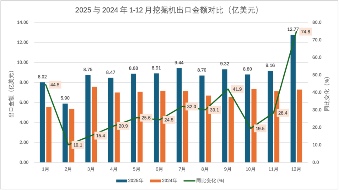 Aus den monatlichen Daten geht hervor, dass die Exportleistung von Raupenbaggern eng mit dem Gesamtmarkt übereinstimmt, mit einem Exportwert von 1,228 Milliarden US-Dollar pro Monat im Dezember, was einer Steigerung von 74,0 % gegenüber dem Vorjahr entspricht, und einem Exportvolumen von 34.000 Einheiten, was einer Steigerung von 65,0 % gegenüber dem Vorjahr entspricht, was eine deutliche Wachstumsdynamik zum Jahresende zeigt. Im Hinblick auf die Veränderungen gegenüber dem Vorjahr verzeichneten sowohl der Exportwert als auch das Exportvolumen in allen Monaten ein positives Wachstum, wobei das Volumen im September um 57,9 % und der Wert im Dezember um 74,0 % stiegen und die wichtigsten Höhepunkte des Jahreswachstums darstellten.