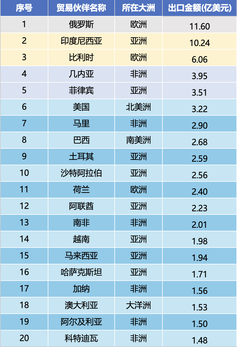 In der Rangliste der Exportmengen von Januar bis Dezember 2025 sind die zehn wichtigsten Handelspartner Russland (1,16 Milliarden US-Dollar), Indonesien (1,024 Milliarden US-Dollar), Belgien (606 Millionen US-Dollar), Guinea (395 Millionen US-Dollar), die Philippinen (351 Millionen US-Dollar), die Vereinigten Staaten (322 Millionen US-Dollar), Mali (290 Millionen US-Dollar), Brasilien (268 Millionen US-Dollar), die Türkei (259 Millionen US-Dollar) und Saudi-Arabien (256 Millionen US-Dollar). Der Gesamtexportwert der Top-Ten-Märkte erreichte 4,93 Milliarden US-Dollar, was 45,9 % des gesamten Exportwerts entspricht, mit einer hohen Konzentration auf den Kernmarkt.