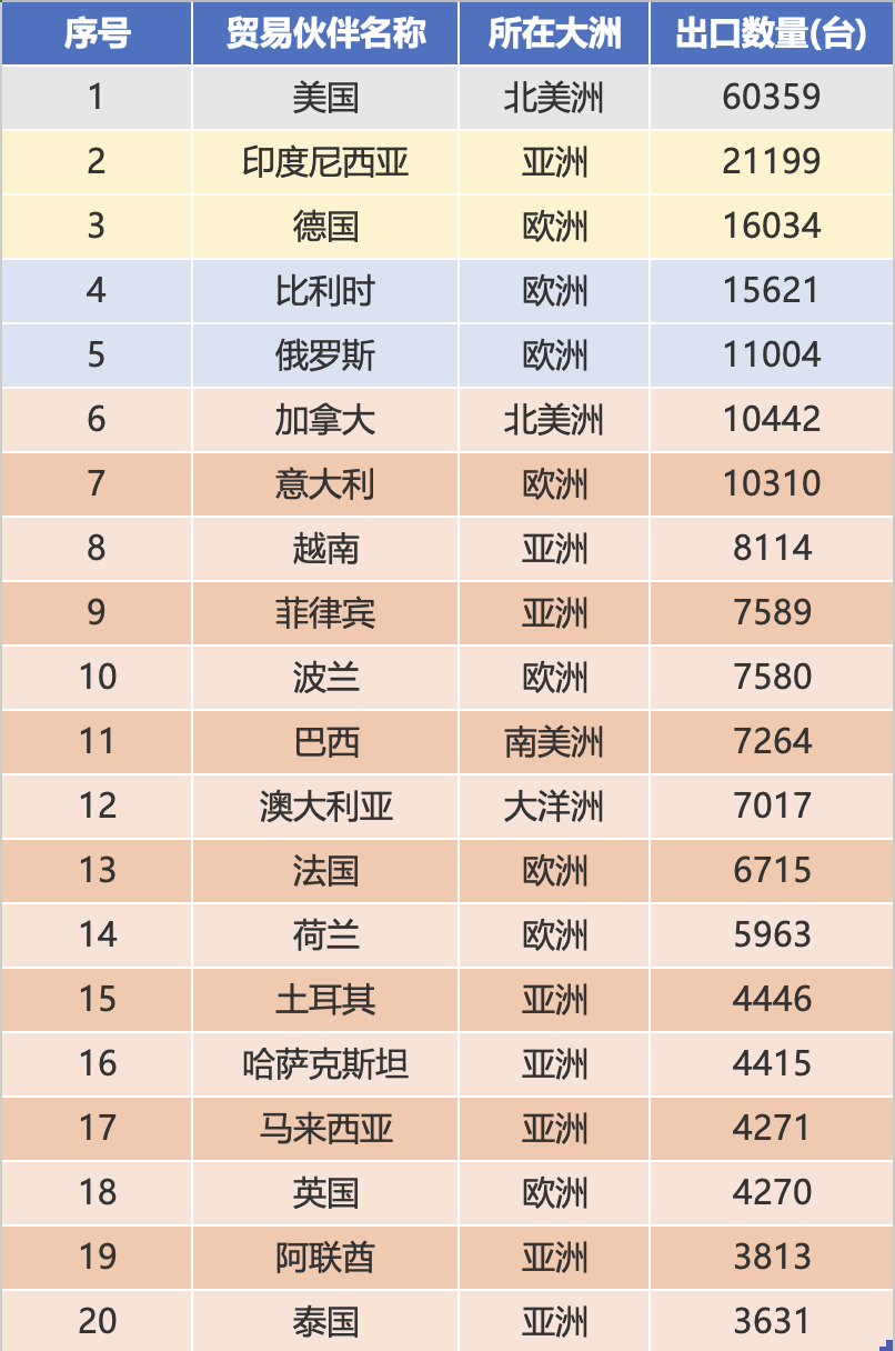 Laut der Rangliste der Exportmengen von Januar bis Dezember 2025 sind die zehn größten Handelspartner die Vereinigten Staaten (60359 Einheiten), Indonesien (21199 Einheiten), Deutschland (16034 Einheiten), Belgien (15621 Einheiten), Russland (11004 Einheiten), Kanada (10442 Einheiten), Italien (10310 Einheiten), Vietnam (8114 Einheiten), die Philippinen (7589 Einheiten) und Polen (7580 Einheiten). Die Gesamtexportmenge der Top-Ten-Märkte erreichte 168.000 Einheiten, was 53,1 % der gesamten Exportmenge ausmacht, was den Skaleneffekt unterstreicht.